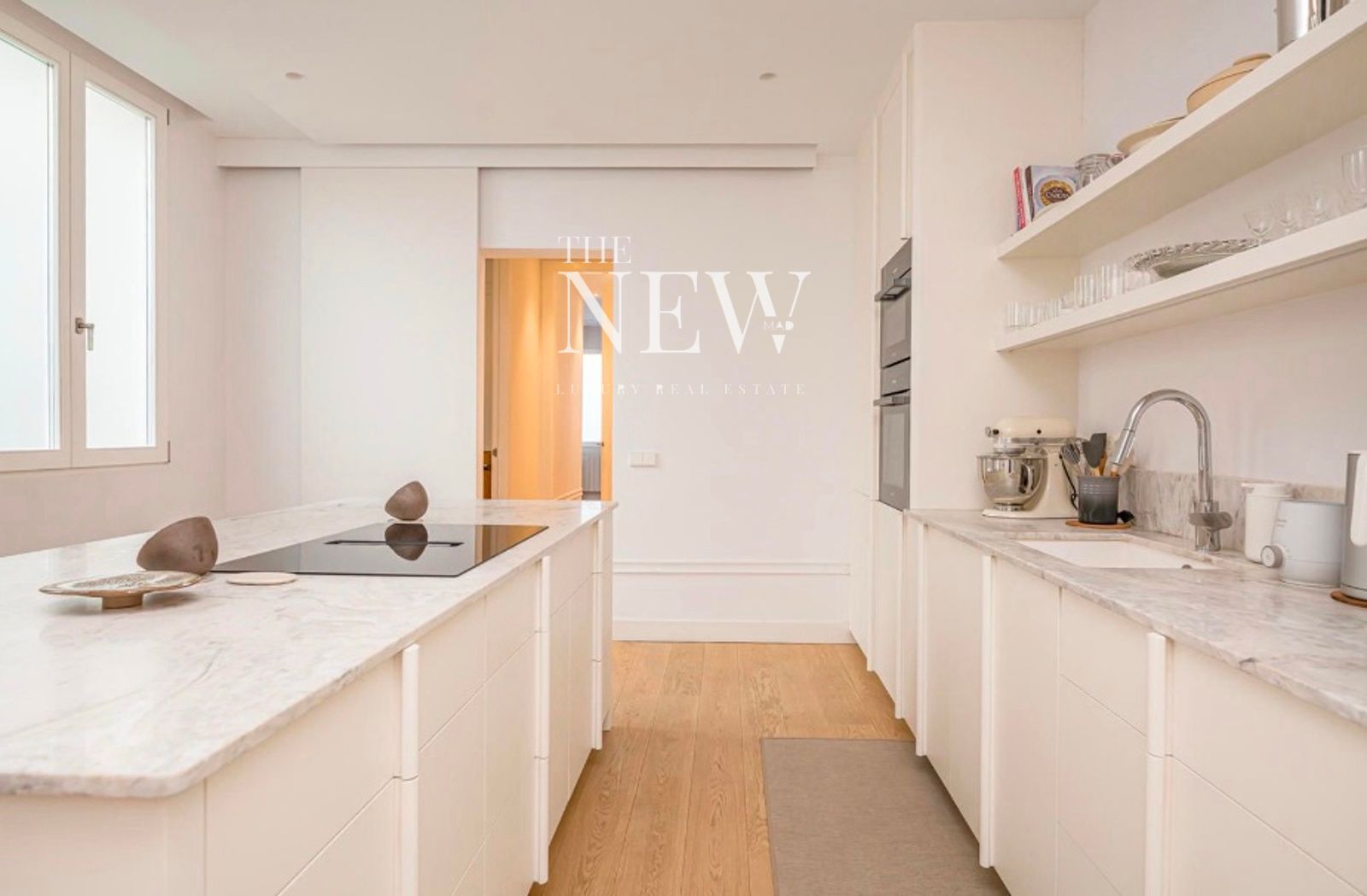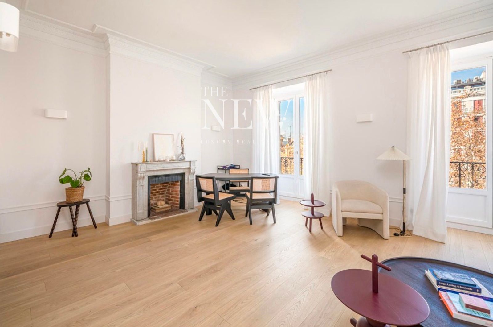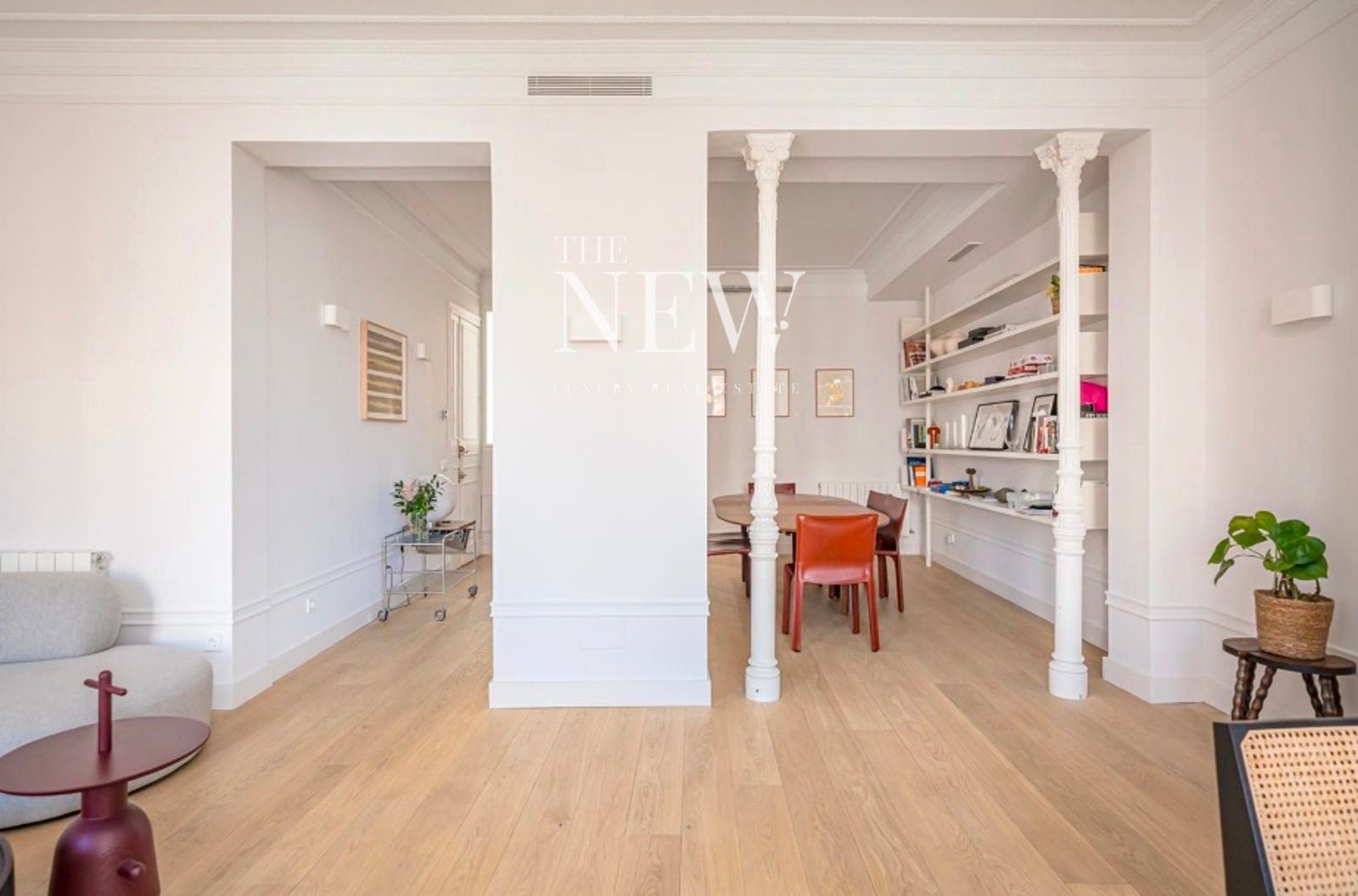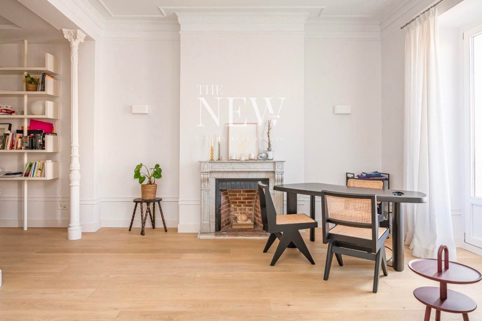 La vivienda, reformada recientemente con un altísimo nivel de exigencia, combina elementos clásicos como columnas originales de hierro y molduras artesanales con acabados modernos de primera calidad. La zona social se compone de un amplio salón-comedor abierto con dos balcones a la plaza y una cocina equipada con electrodomésticos Miele y encimeras de cuarcita pulida. La zona de descanso cuenta con dos dormitorios y dos baños revestidos en mármol Tundra; el dormitorio principal en suite dispone de un elegante vestidor a medida. Detalles como las puertas de suelo a techo y la grifería Icónico completan esta joya en el centro de Madrid.