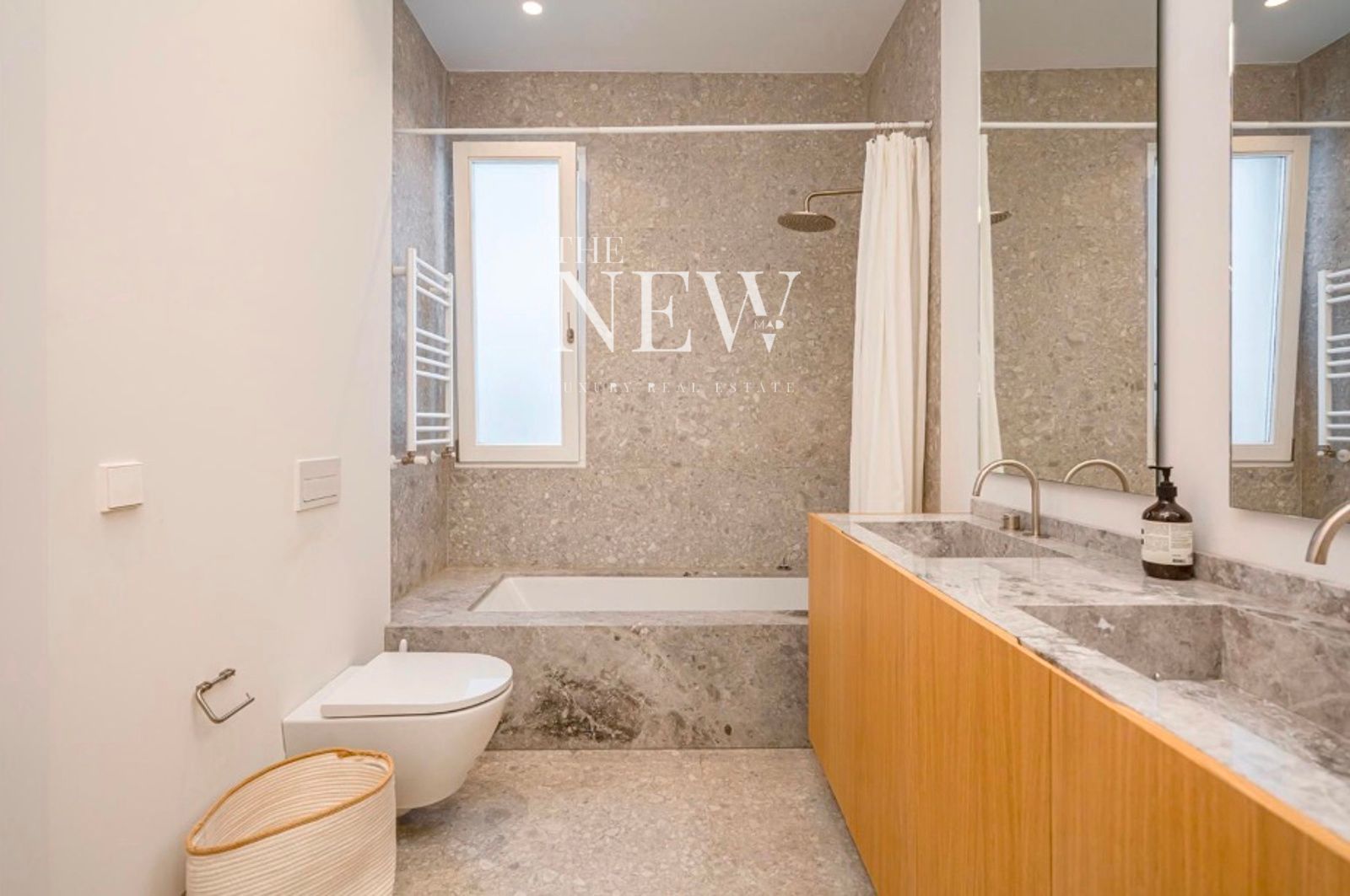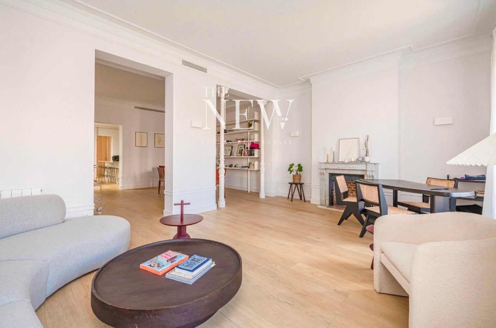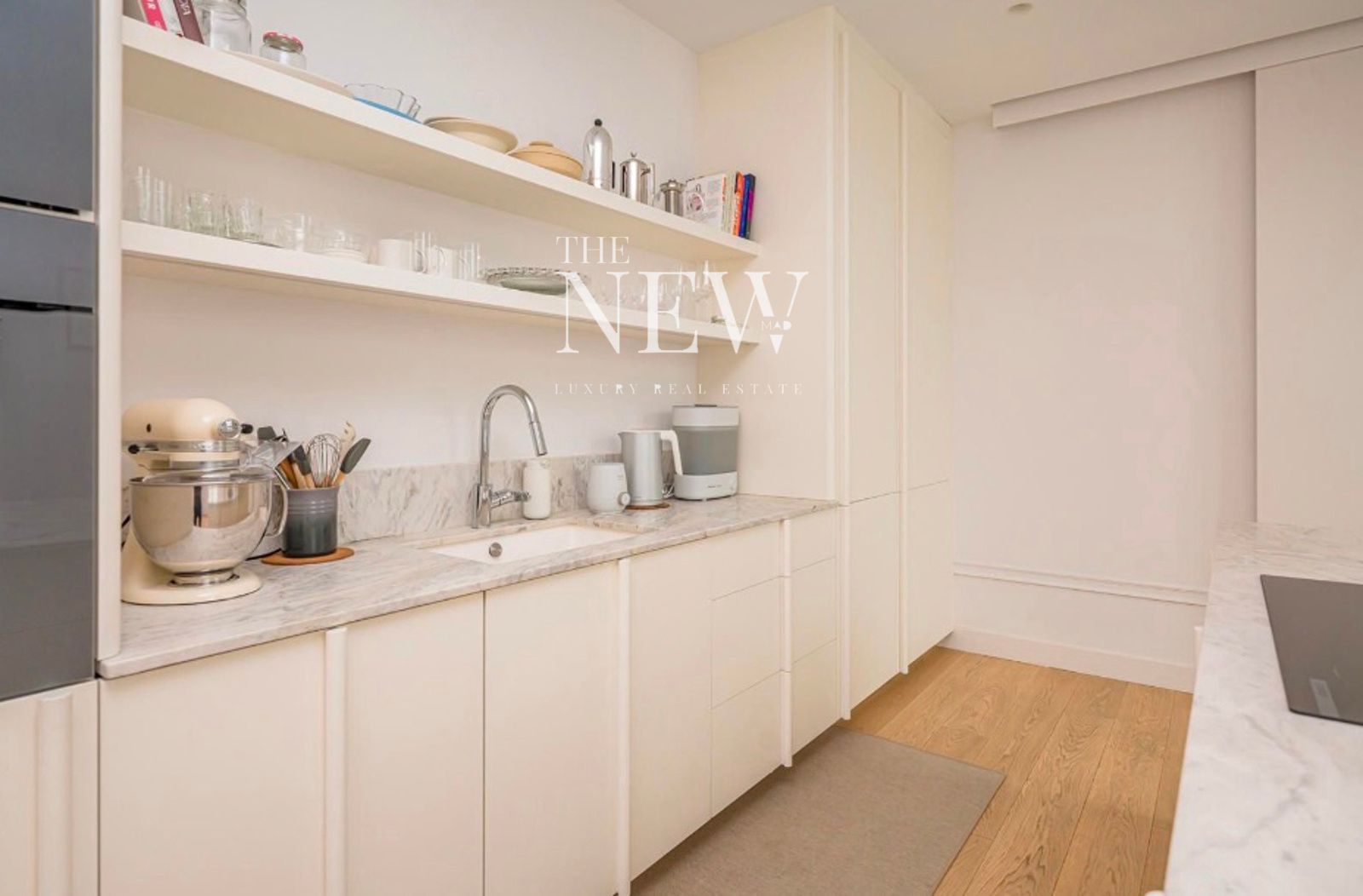La vivienda, reformada recientemente con un altísimo nivel de exigencia, combina elementos clásicos como columnas originales de hierro y molduras artesanales con acabados modernos de primera calidad. La zona social se compone de un amplio salón-comedor abierto con dos balcones a la plaza y una cocina equipada con electrodomésticos Miele y encimeras de cuarcita pulida. La zona de descanso cuenta con dos dormitorios y dos baños revestidos en mármol Tundra; el dormitorio principal en suite dispone de un elegante vestidor a medida. Detalles como las puertas de suelo a techo y la grifería Icónico completan esta joya en el centro de Madrid.