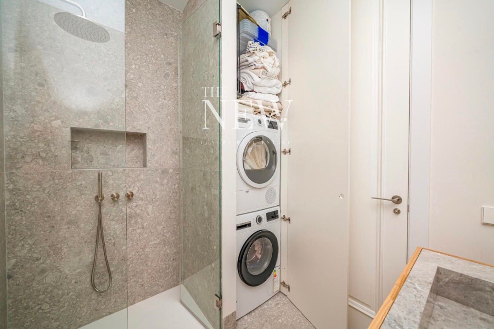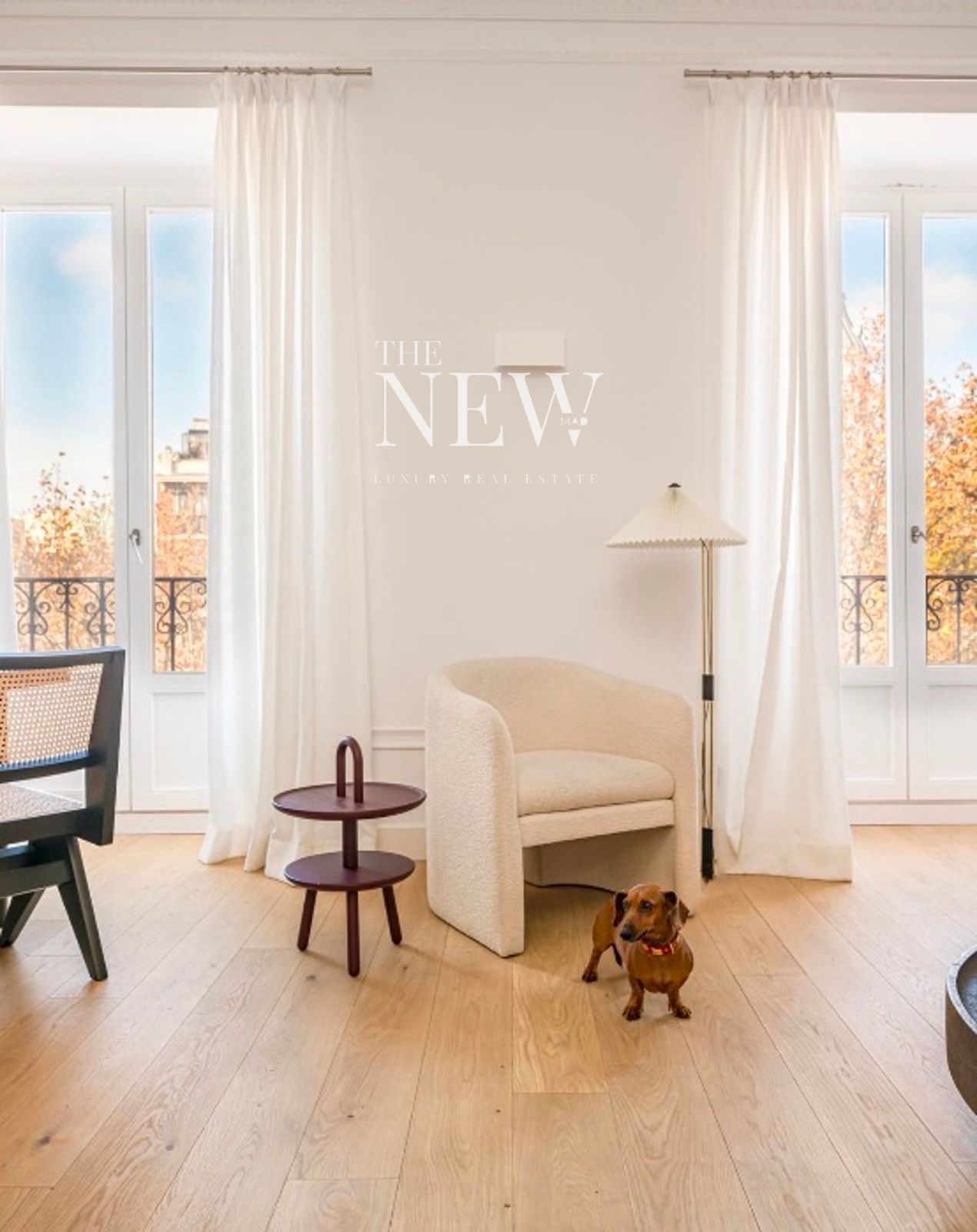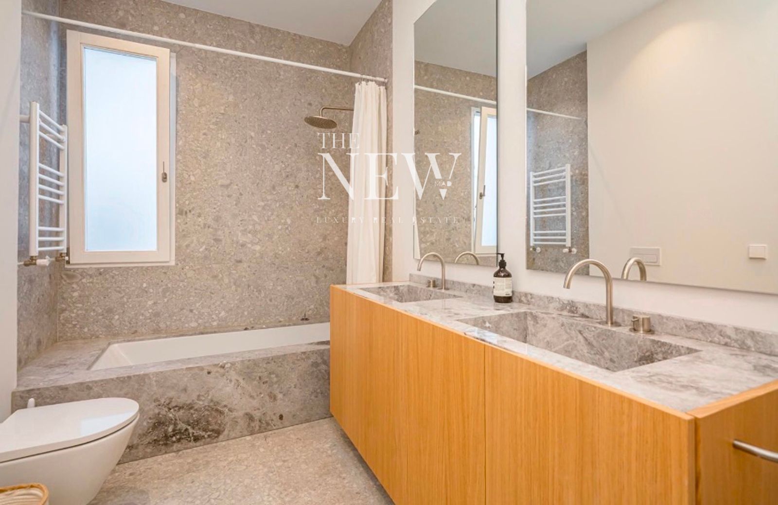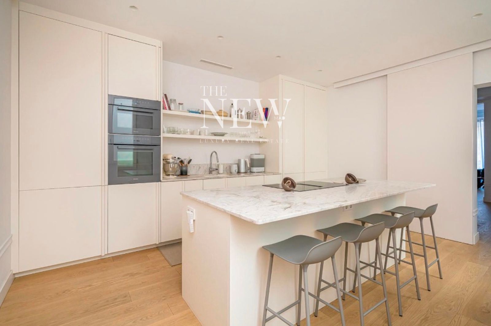La vivienda, reformada recientemente con un altísimo nivel de exigencia, combina elementos clásicos como columnas originales de hierro y molduras artesanales con acabados modernos de primera calidad. La zona social se compone de un amplio salón-comedor abierto con dos balcones a la plaza y una cocina equipada con electrodomésticos Miele y encimeras de cuarcita pulida. La zona de descanso cuenta con dos dormitorios y dos baños revestidos en mármol Tundra; el dormitorio principal en suite dispone de un elegante vestidor a medida. Detalles como las puertas de suelo a techo y la grifería Icónico completan esta joya en el centro de Madrid.